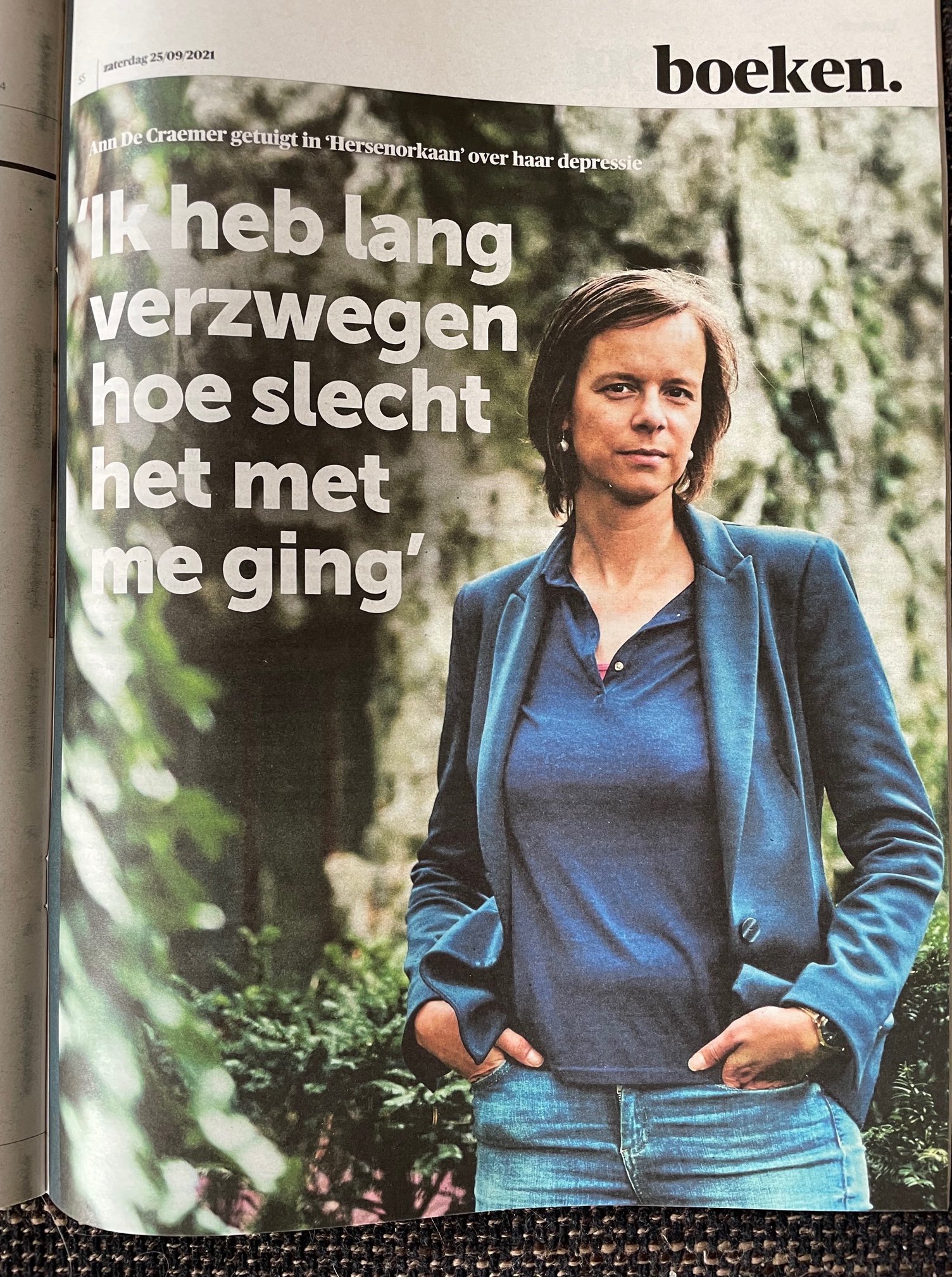 Hoeveel keer heb ik die zinnen niet herlezen? En gedacht: hoe kan het dat Karl, met wie ik inderdaad om de paar maanden gewoon een bericht uitwissel, en die ik maar twee keer in het echt heb ontmoet, zo goed aanvoelt waarom alle zin in het leven op een bepaald moment uit mij verdwenen was, zozeer zelfs dat ik er gewoon niet meer wilde zijn? Want ja, het had alles met die ambitie te maken. De eerste depressie was rouw om het verlies van een grote liefde, maar de tweede had alles met werk te maken. Toen De Morgen in 2021 besloot om een punt te zetten achter mijn column, was de klap enorm. Ik had vijftien jaar voor hen geschreven, en de laatste twee jaar mocht ik twee keer per week een column voor de papieren krant schrijven. Dat maakte me zo trots: ik was altijd een schrijver willen zijn die midden in de samenleving staat, en een plek in een krant geeft je die kans.