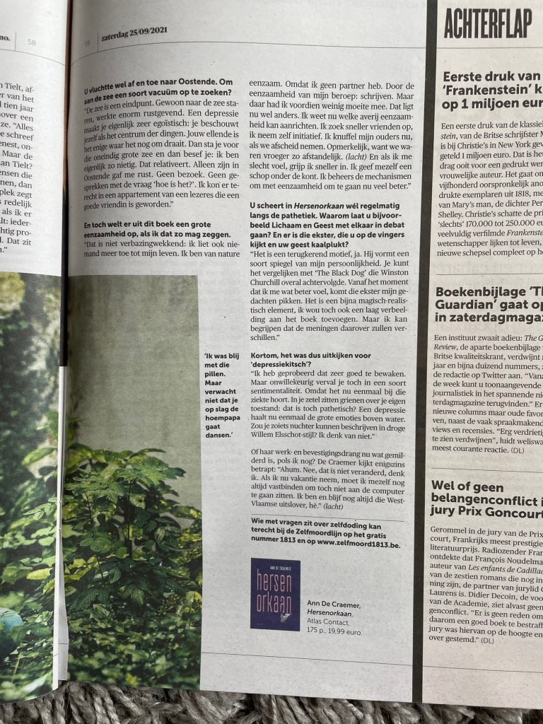 Nog dit: het zijn harde tijden. Zorg voor mekaar. In ‘Hersenorkaan’ heb ik laten zien wat niet praten over je mentale welzijn betekent. Zoek hulp als het niet lukt. Met psychiaters en medicatie is er niets mis. En: beweeg, beweeg, beweeg, al is het elke dag maar een half uur. Zoek troost bij uw huisdier. Schrijf berichtjes naar zij die er alleen voor staan. Wees lief. Wees zorgzaam. Dan komen we er samen wel uit.