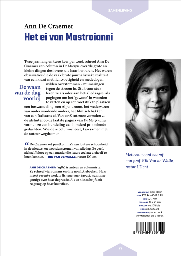 Sinds vorige donderdag ligt mijn nieuwe boek Het ei van Mastroianni in de winkel. Het is een bundeling van de beste tachtig columns die ik tijdens mijn laatste twee jaar als columniste voor De Morgen schreef.