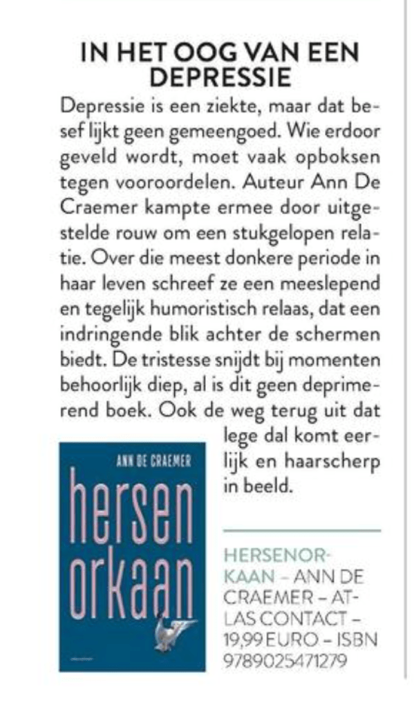 Een kleine maar fijne recensie van Hersenorkaan in de nieuwe Plus Magazine. Ik ben blij dat ze het over de humor hebben en melden dat het geen deprimerend boek is. Dat is het ook helemaal niet. Wees dus niet bang om het cadeau te geven aan mensen die zelf aan een depressie lijden of aan geliefden die zorgen voor iemand met de ziekte. Als er één rode draad is in het boek, dan wel die van de hoop.