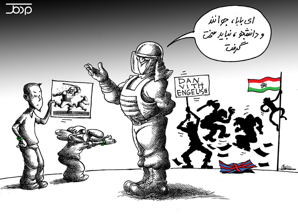 Een student die aanhanger is van de Groene Beweging laat de politieman zien hoe zij werden behandeld toen ze protesteerden tegen de fraude van de presidentsverkiezingen twee jaar geleden. De man antwoordt: “Ach, het zijn maar studenten, take it easy.” Opvallend is het ook het bord dat de bestormer van de ambassade in de achtergrond vasthoudt, met het fout gespelde ‘Dan Vith Engelish’: de slogans van de bestormers zaten inderdaad vol taalfouten, want het ging niet om studenten maar om vaak onopgeleide basiji.