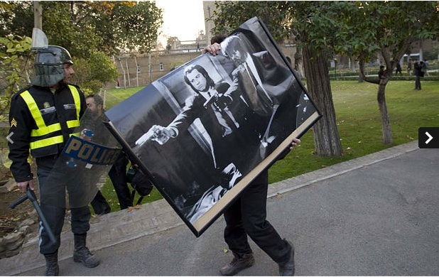Ook opmerkelijk is deze foto die ik dinsdag op de site van AlJazeera zag. De islamitische militante studenten die de ambassade bestormden schreeuwden slogans tegen Groot-Brittannië en het westen, maar hun “anti-Britse” en “anti-westerse gevoel” blijkt snel te verdwijnen wanneer ze uit de Britse ambassade een foto kunnen stelen van….Vince Vega uit de film ‘Pulp Fiction’. De politie, die tegen echte studenten hun wapenstokken maar al te graag gebruikt, kijkt glimlachend toe.