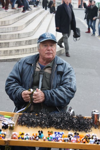 Zoals je aan de voet van het Alborzgebergte in Noord-Teheran een spectaculair uitzicht over de stad hebt, is Montmartre in Parijs de plek waar je de daken van de metropool kan zien. De Sacré-Coeur straalde weelderig als altijd, en een spandoek vertelde ons dat ‘hier al meer dan 125 jaar dag en nacht iemand bidt tot de Heer’. De trappen naar de basiliek werden gewit door allochtone straatwerkers die niet neerknielden voor een plek naast God in de Hemel, maar voor het beleg op hun boterham. Iets verderop zat een man in een rolstoel aan een tafel. Met gekleurde ijzerdraadjes maakte hij hondjes die dan aan een sleutelhanger werden bevestigd. In een micro die op zijn borst zat geklemd vertelde hij met veel overtuiging wat hij deed. ‘Deze kleine hondjes brengen geluk….eerst het kleine staartje….dan de kleine pootjes….et hup!….tot slot de kleine oogjes.’ De man wist een heel publiek te entertainen, en dat hij zijn show beslist al duizenden keren had opgevoerd leek zijn enthousiasme niet te temperen. ‘Een geluksbrenger!’ lachte hij. ‘Ze bijten niet, plassen niet op het tapijt en zijn net zo lief als ik.’ Ik verjaagde de gedachte dat de Parijzenaar, die het ene hondje na het andere verkocht, in het echt misschien rijk was, en ik kocht een sleutelhanger, en ik dacht aan de betekenis van Vali Asr, ‘prins van deze tijd’, en vraag me nog steeds af of het een teken van onze tijd is dat ik een complot vermoedde achter een oude man die erin slaagde zo prinselijk arm te zijn.