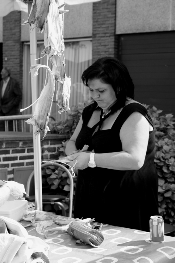 Onafscheidelijk op elke koers onder de toren: een kraam met droogvis
