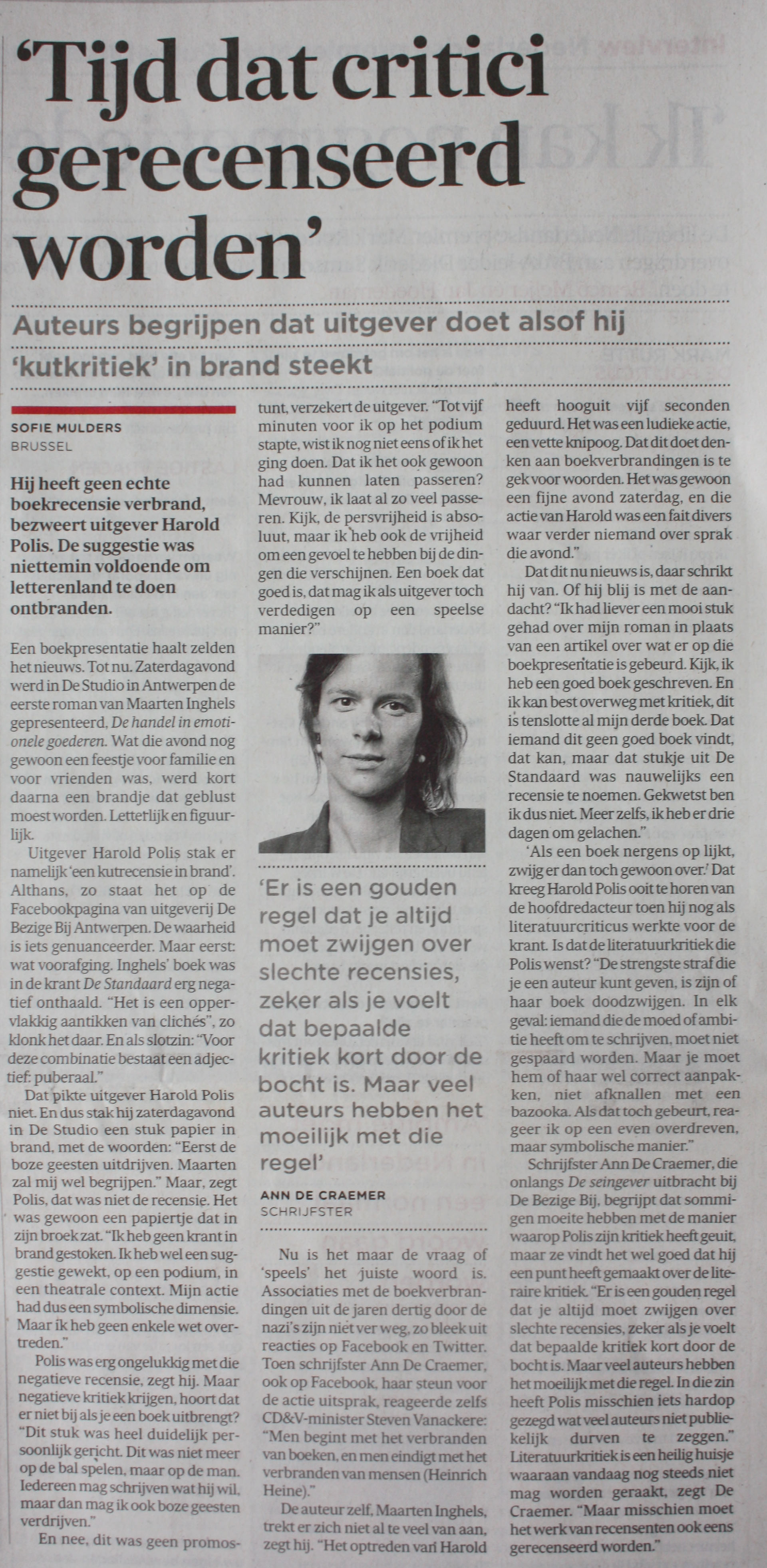 Artikel uit De Morgen, 11 september – (klik op afbeelding om te vergroten). Ik heb de daad van Harold Polis vooral gezien als een ludiek statement van een uitgever die zijn debuterende auteur een hart onder de riem steekt. Bovendien: als auteurs recensies (die steeds korter worden) moeten relativeren waarin soms onbeargumenteerd en kort door de bocht hun werk wordt neergesabeld, moeten recensenten ook zichzelf kunnen relativeren. Ook dat is part of the game.