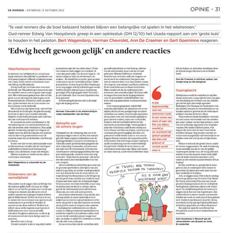 Hieronder de iets uitgebreidere versie van mijn opiniestuk over de zaak-Armstrong, dat vandaag in De Morgen staat, naast de reacties van Bert Wagendorp, Gert Goeminne en Herman Chevrolet.