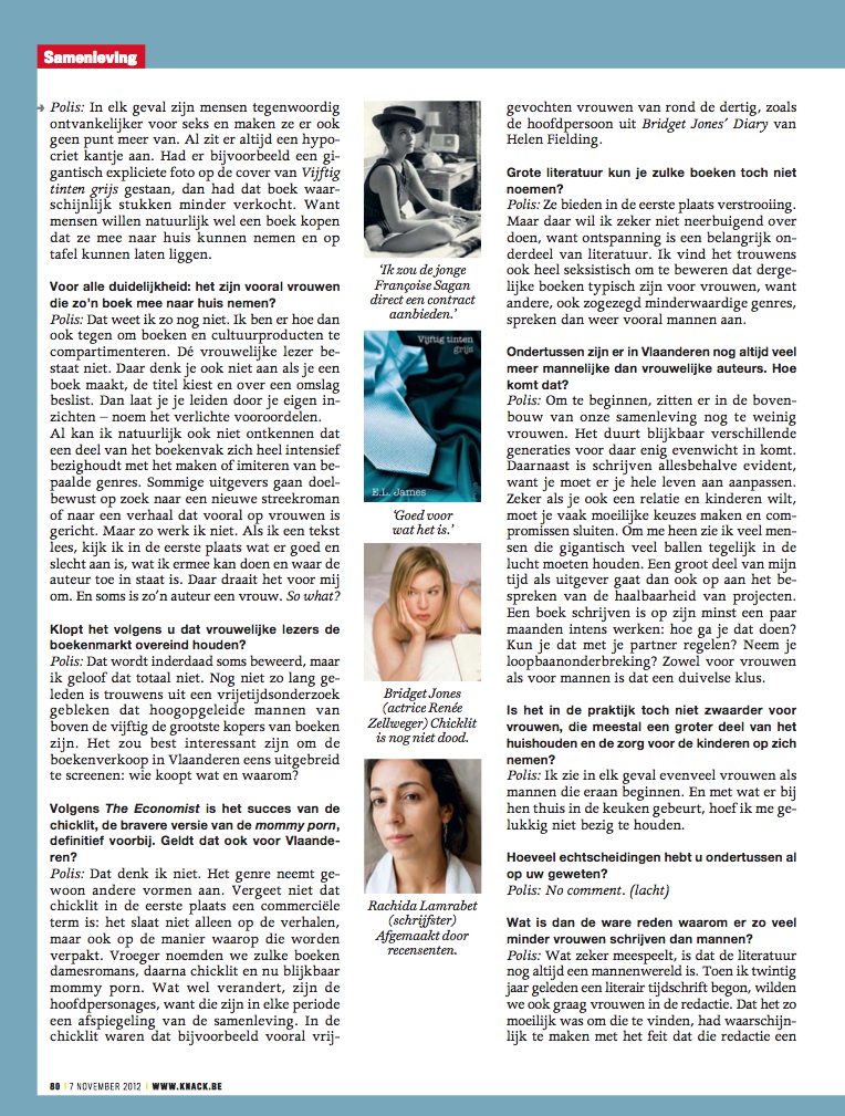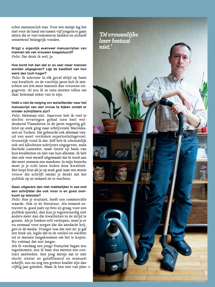 In Knack staat deze week een interessant interview met mijn uitgever Harold Polis, over vrouwen die schrijven. Ik geef hem overschot van gelijk: ik kan niet meer tellen hoe vaak ik over mijn debuut Vurige tong de vraag heb gekregen of ik ‘niet te hard ben, voor een vrouw’. Die laatste drie woorden worden dan uiteraard door mannelijke interviewers/recensenten gesteld, en komen vaak met een sussend glimlachje. Er was er zelfs een, nochtans geen ‘prutser’ meer, die tegen me zei: “Als je wil doorbreken, zou je je misschien best wat zachter opstellen.”