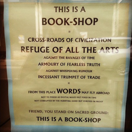 Ik vertaal: “Dit is een boekhandel. Kruispunt van beschaving. Schuilplaats van alle kunsten tegen de verwoesting van de tijd. Wapenarsenaal van onverschrokken waarheid tegen gefluisterde geruchten. Onstuitbare klaroen van vakmanschap. Hier kunnen woorden naar buiten vliegen, niet om te stranden als digitale golven maar verankerd in de tijd; niet besmet door de gehaaste hand maar trouw aan de waarheid. Vriend, u staat op gewijde grond: dit is een boekhandel.” Dat is nog eens een sexyer slogan dan ‘ik ben toch niet gek’, en ik roep dan ook alle boekhandelaren van Vlaanderen en Nederland op om deze tekst vanaf vandaag aan de deur van hun winkel te hangen.