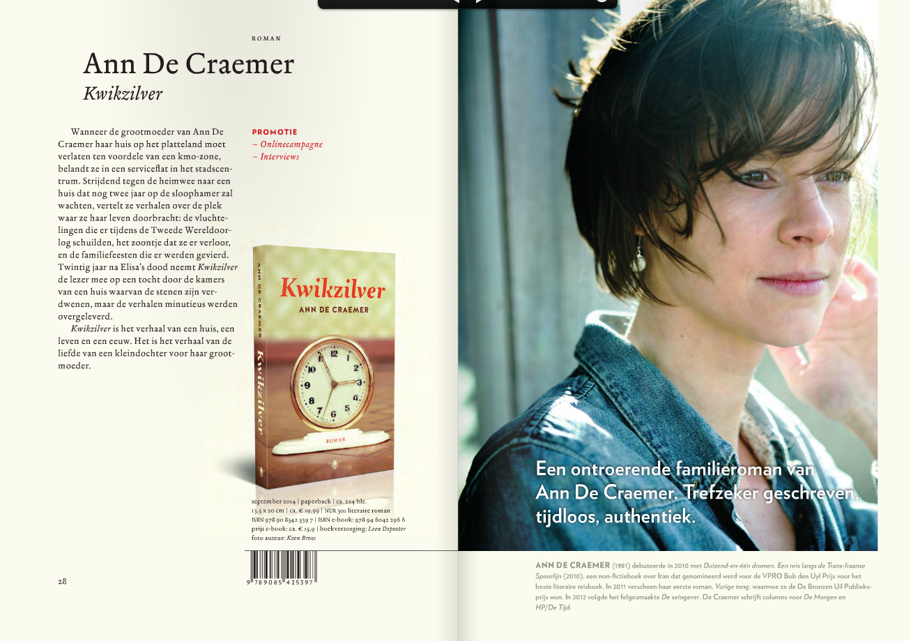‘Kwikzilver’: de voorgeboorte 28 maart 201428 maart 2014 / Ann De Craemer Deze week is de zomeraanbieding van De Bezige Bij Antwerpen verschenen, met daarin ook de aankondiging van mijn nieuwe roman Kwikzilver. Trots! (En klik op de afbeeldingen om ze te vergroten) Dit delen: Klik om te delen op X (Opent in een nieuw venster) X Klik om te delen op Facebook (Opent in een nieuw venster) Facebook Klik om dit te e-mailen naar een vriend (Opent in een nieuw venster) E-mail Klik om te delen op WhatsApp (Opent in een nieuw venster) WhatsApp Klik om te delen met Reddit (Opent in een nieuw venster) Reddit Klik om op Tumblr te delen (Opent in een nieuw venster) Tumblr Klik om af te drukken (Opent in een nieuw venster) Print Klik om op LinkedIn te delen (Opent in een nieuw venster) LinkedIn Vind-ik-leuk Aan het laden... Gerelateerd