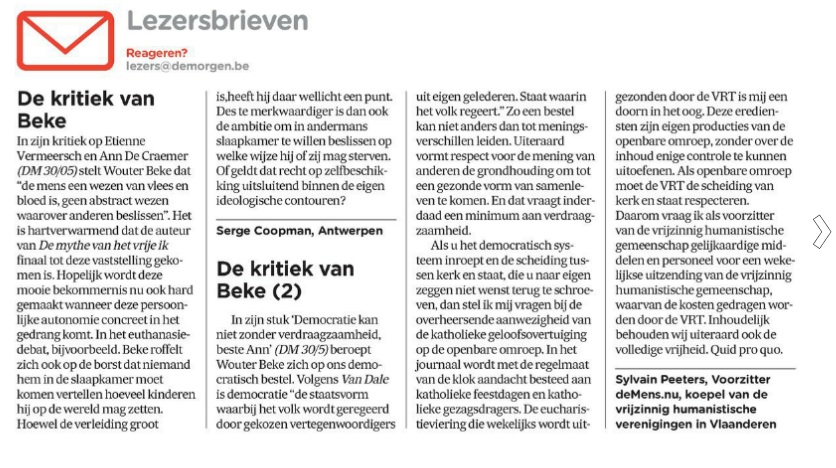 Mijn opiniestuk van zaterdag waarin de katholieke feestdagen op de korrel neem en de reactie van CD&V-voorzitter Wouter Beke daarop blijven voor reacties zorgen. Vandaag staan in De Morgen twee lezersbrieven over de reactie van Beke (klik op de afbeelding om te vergroten).