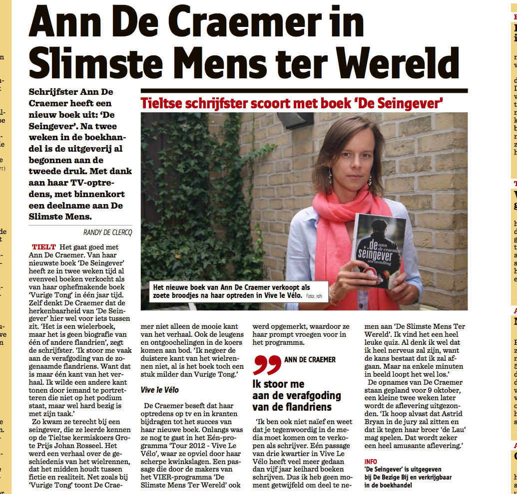 Ann De Craemer (1981) schrijft voor De Morgen, is Iran-deskundige en won vorig jaar De Bronzen Uil Publieksprijs. Haar vorige boeken Vurige tong en Duizend-en-één-dromen hebben mij enorm gecharmeerd, maar aan De seingever ben ik met een lichte tegenzin begonnen, omdat ik (buiten een nogal koersminnende vader, die inmiddels lang overleden is) niets met wielrennen heb. Maar toch wou ik absoluut dit boek lezen, omdat ik mij niet kon voorstellen dat een auteur als Ann De Craemer mij niet zou kunnen boeien. En ja hoor, van bladzijde één was ik mee. Lees verder