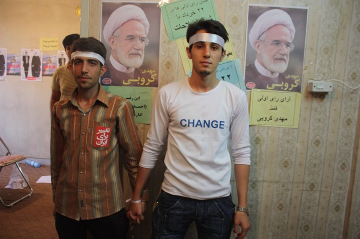 We wandelen verder en stuiten op een ander campagneteam: dat van Mehdi Karroubi. Sadeq Chehrqani is twintig en zegt dat vele kandidaten voor de verkiezingen maar een paar maanden daarvoor de politieke arena betreden, maar dat geldt niet voor Karroubi: hij heeft ervaring in de Iraanse politiek. “Karroubi zal vrouwen en etnische en religieuze minderheden beter behandelen. Hij heeft de jonge mensen ook verandering beloofd.” Achter Sadeq (links) hangt een poster van Karroubi waarop in grote Perzische letters ‘BIG CHANGE’ staat.