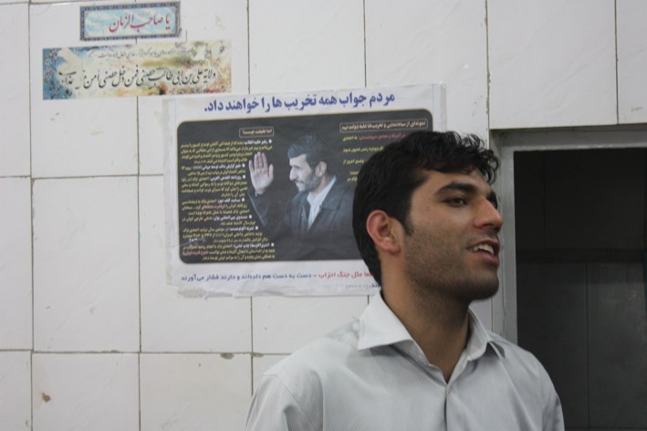 Mohammed Hussein (25) duwt Pezhman weg en zegt dat Ahmadinejad de enige keuze voor Iran is, omdat hij de morele waarden van dit land verdedigt. Bovendien: “Mousavi is een zwak man, want hij kan niet zonder de steun van Khatami.” Mohammed lijkt steekt een stevig betoog te willen afsteken, maar wordt plots naar buiten geduwd door een aantal aanhangers van Mousavi. “De fans van Ahmadinejad hebben genoeg kansen om hun boodschap te verkondigen. Dit is ons hoofdkwartier, en hier moeten ze wegblijven.”